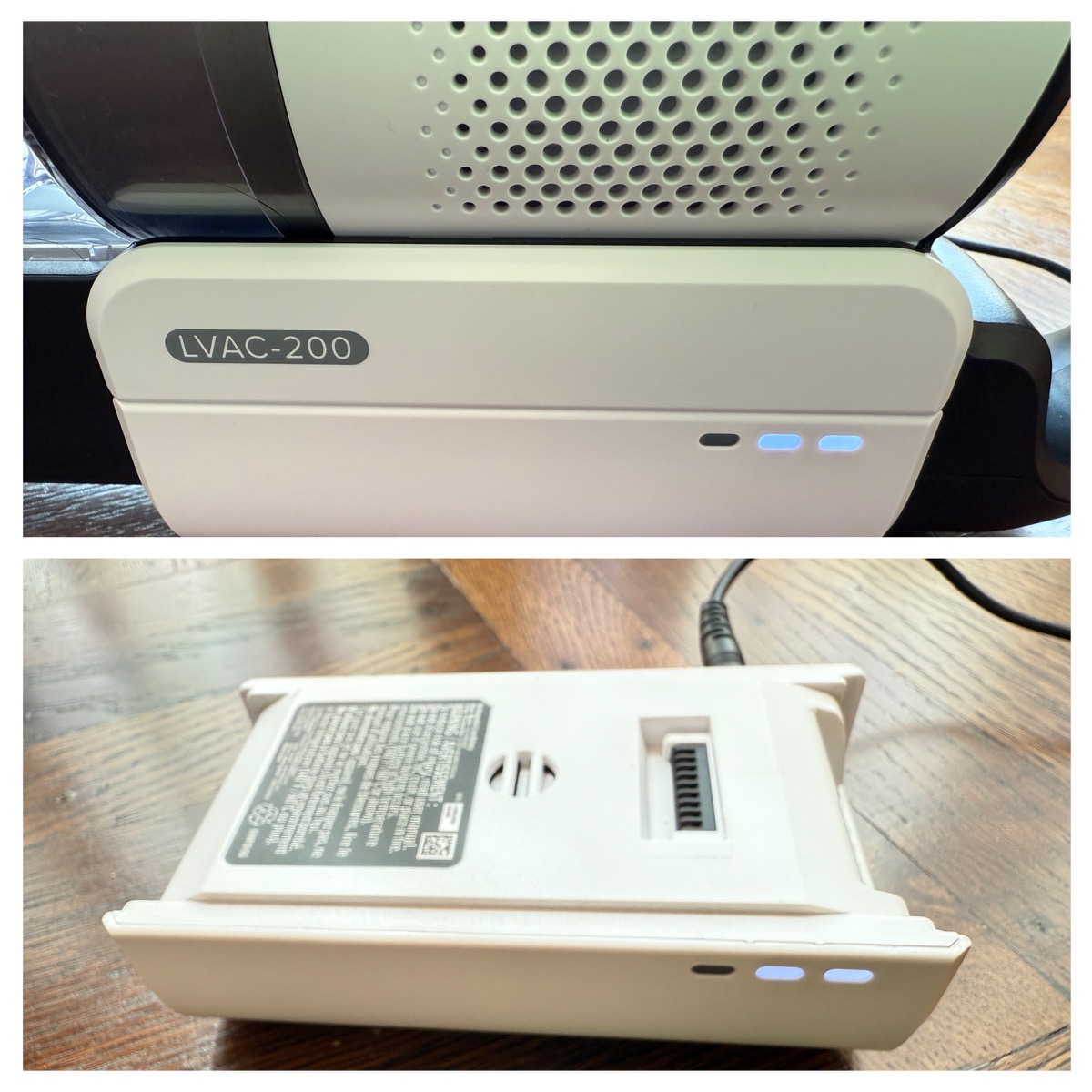 Both models feature detachable batteries with 3 LED indicators on the side. While the batteries look identical (LVAC-200 in white, LVAC-300 in blue), they are not interchangeable. You do not have to remove the battery to charge. It can remain on the vacuum.