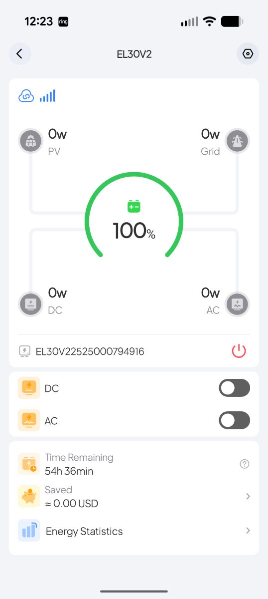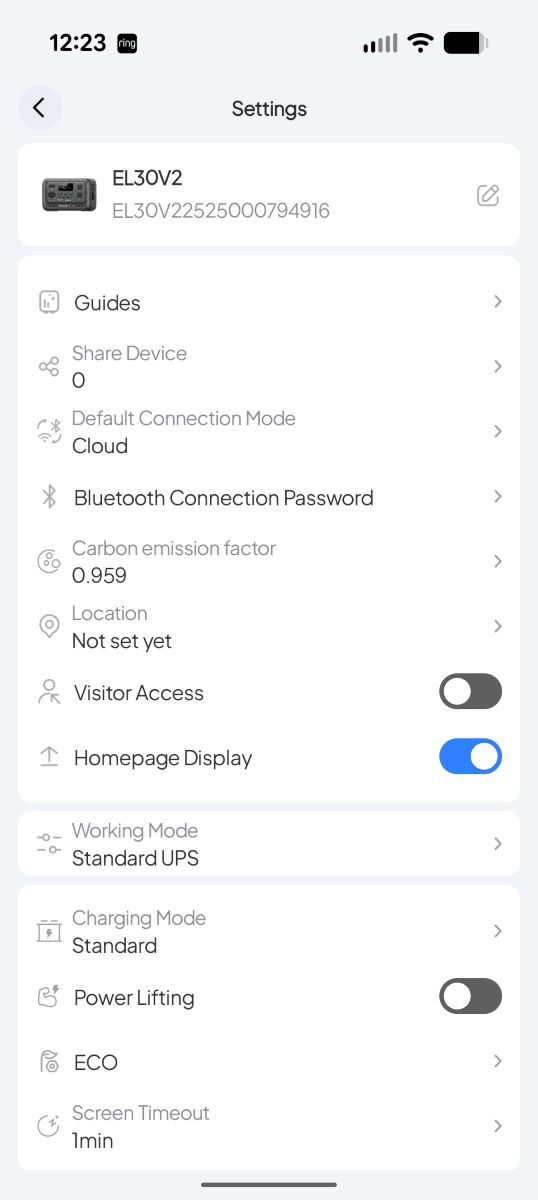 There is no setup you really need to do out of the box. The unit I received came with about a 37% charge when I took it out of the box. So, I plugged it in and fully charged it before testing. There is a way to get into the settings of the Elite 30 V2 by holding down the AC and DC buttons while powering it on. From there, you can use the buttons to make changes. The other way is the Bluettis app, which gives you more granular controls to change some defaults and allows you to fine-tune some things. The only thing I did was use the app to update to the latest firmware via a Bluetooth connection. I didn’t see the need to change anything else for my use case. I have included several pics of the app to let you see it, though.