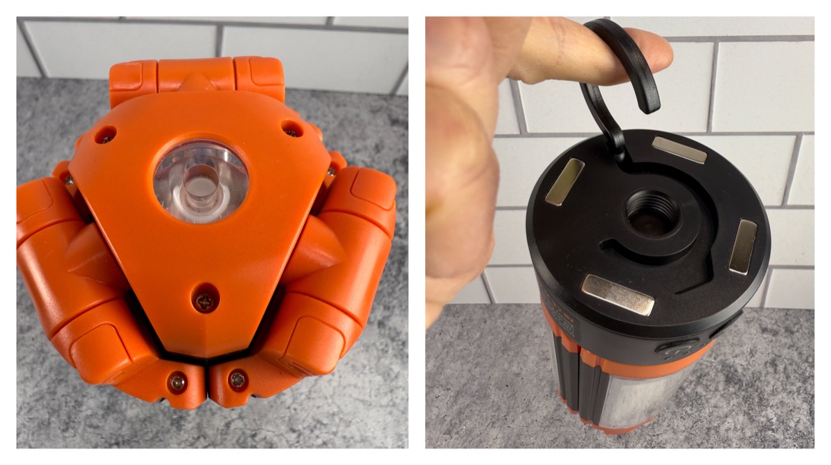 The top of the lamp is a single LED that acts as a standard flashlight. On the bottom is a very clever folding hook and some powerful magnets.