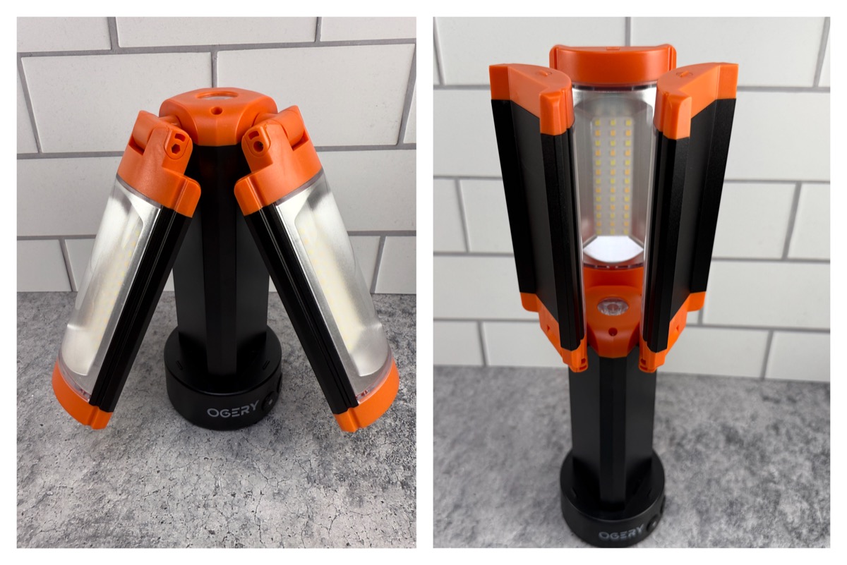 The OGERY Z10 is a rechargeable LED light with three rotating panels that can point light in every direction. It can mount on the included stand, or hang it up via built-in hook or magnets.