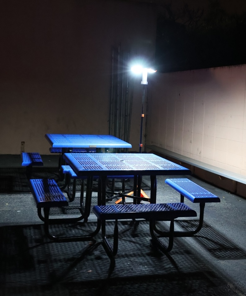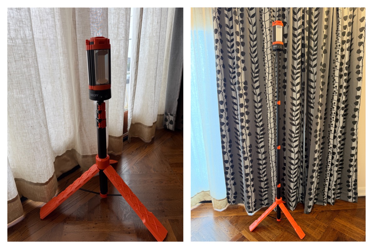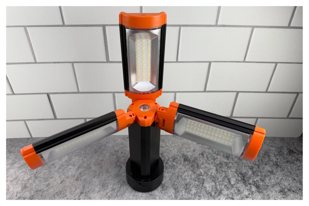 I really like how versatile the panels are. Now I can light up the area around me, or point in one direction, or even a little of both! That hook will come in handy for tent camping, and the magnetic base will let me get some light when working under the hood of a car. I like the traffic cone-colored orange. It’s pretty conspicuous! Hopefully nobody tips it over at full height, since it’ll go over at 9 degrees from vertical.