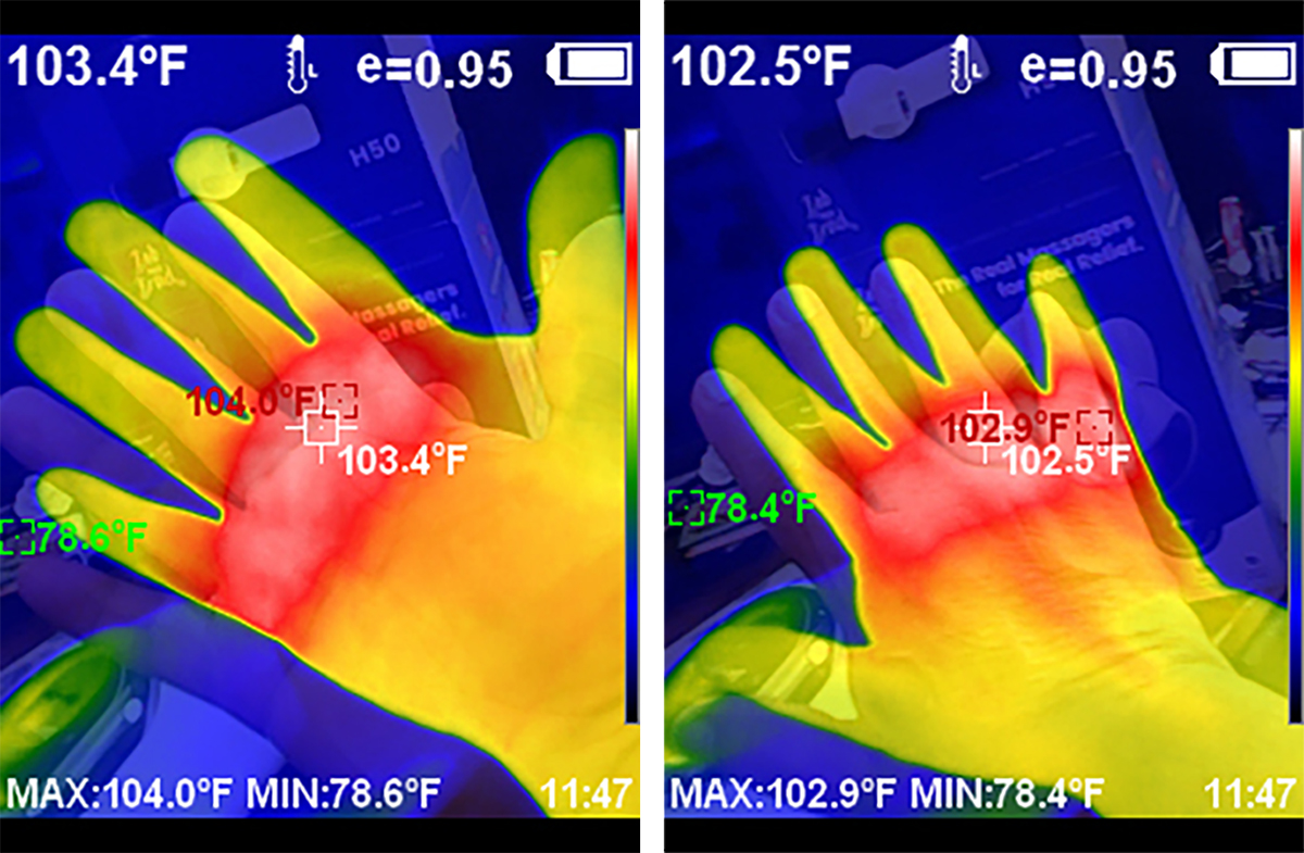 The massager has a control panel for selecting the settings. When it is worn on the right hand, the control panel sits above the palm. For the left hand, it sits on the back of the hand.