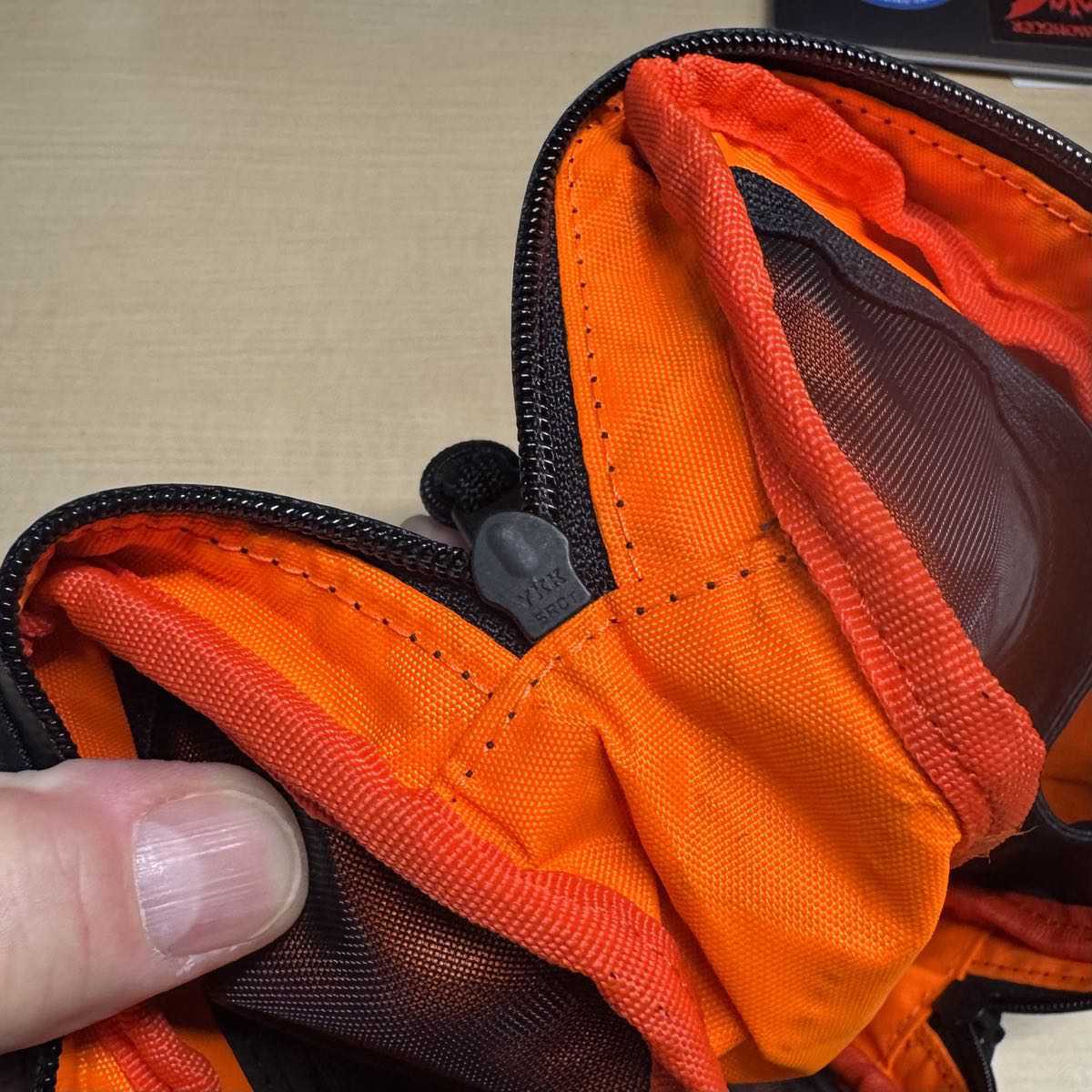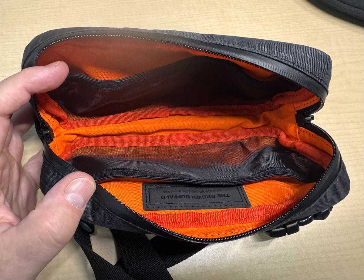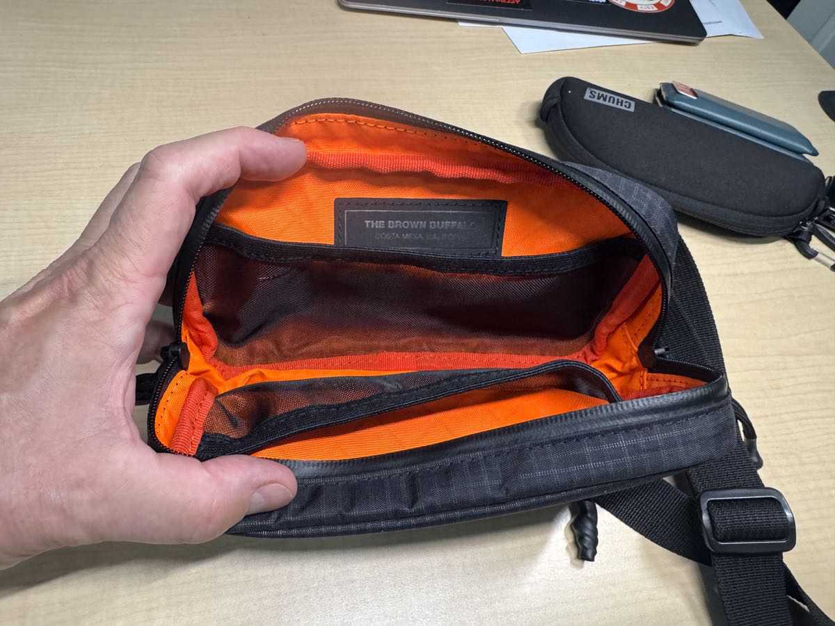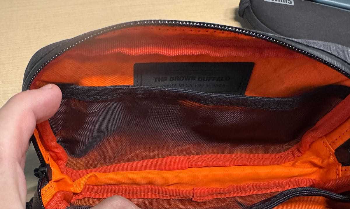 The aforementioned dual zips slide 2/3 down the sides for what The Brown Buffalo describes as a “taco” style opening, allowing full access to all the corners of the bag. Between that and the bright orange interior you won’t be losing anything in this space.