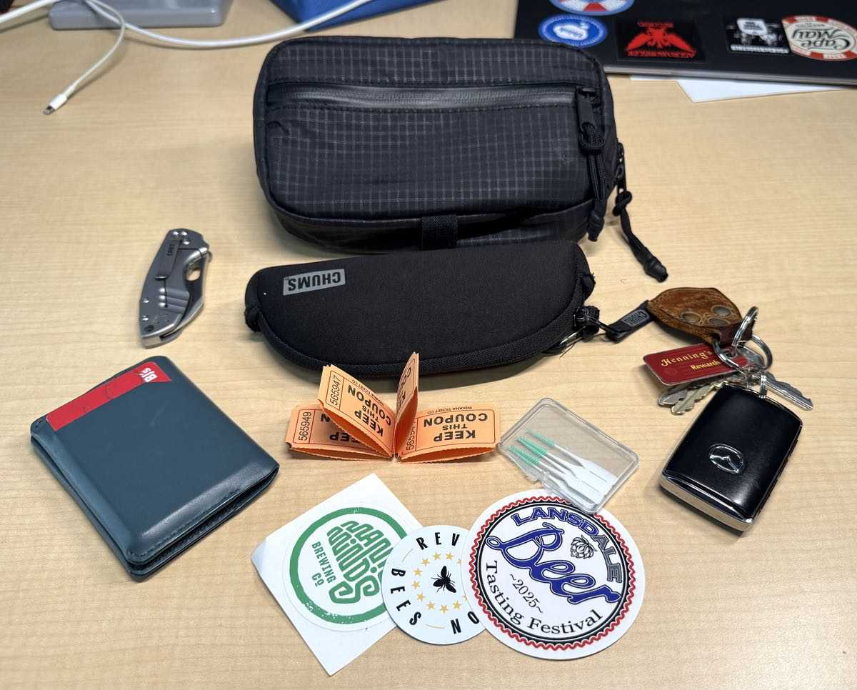 The Brown Buffalo Conceal Waistpack is perfectly size for dumping your pockets into a minimalist EDC bag. This was my loadout for a recent local outdoor beer festival. I was collecting stickers and raffle tickets in the front pocket, while the rest (sunglasses, pocket knife, keys, sunglasses, wallet, iPhone 15 Pro Max w/case) went in the main compartment. I may be able to fit a few other small items in there.
