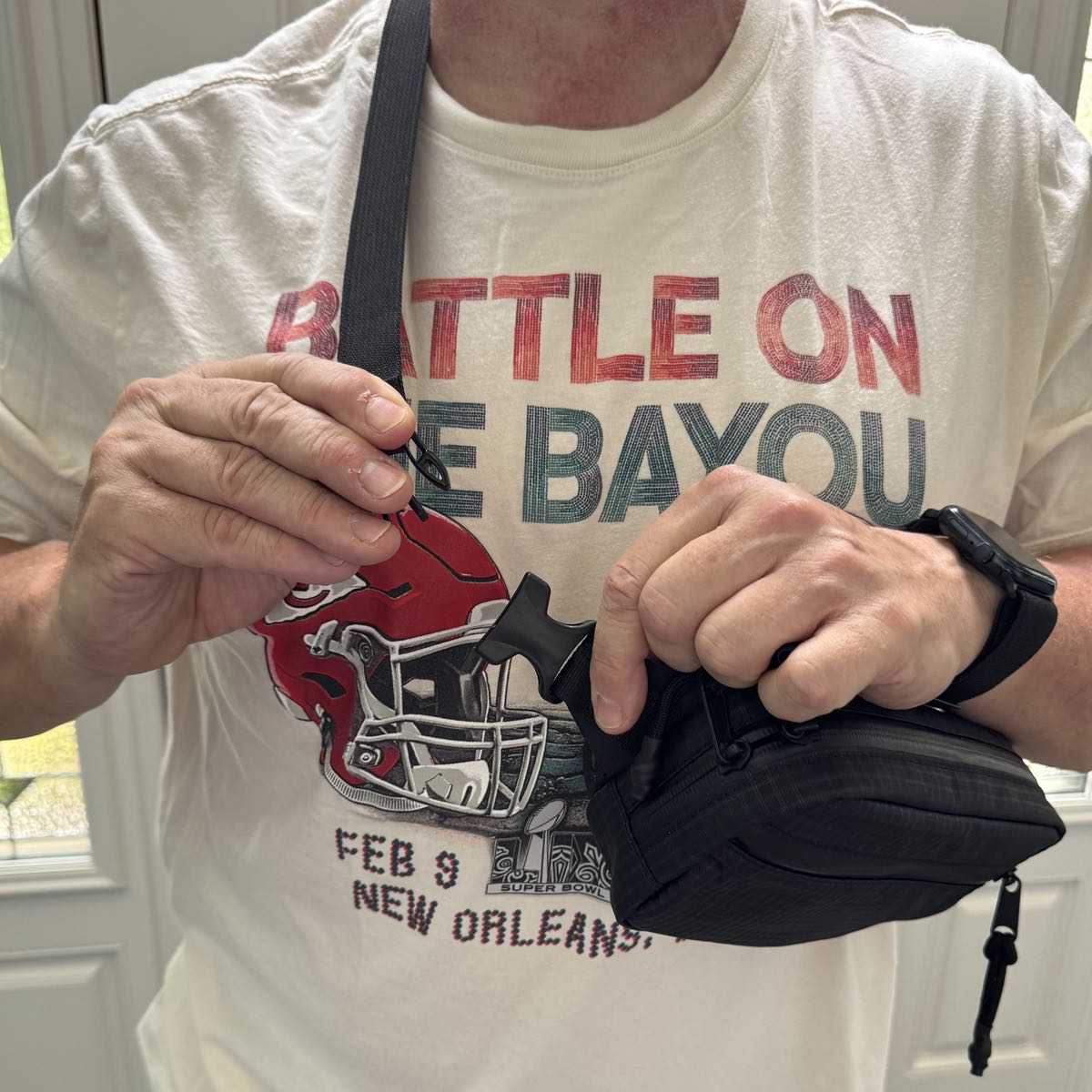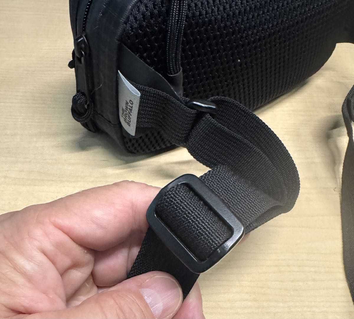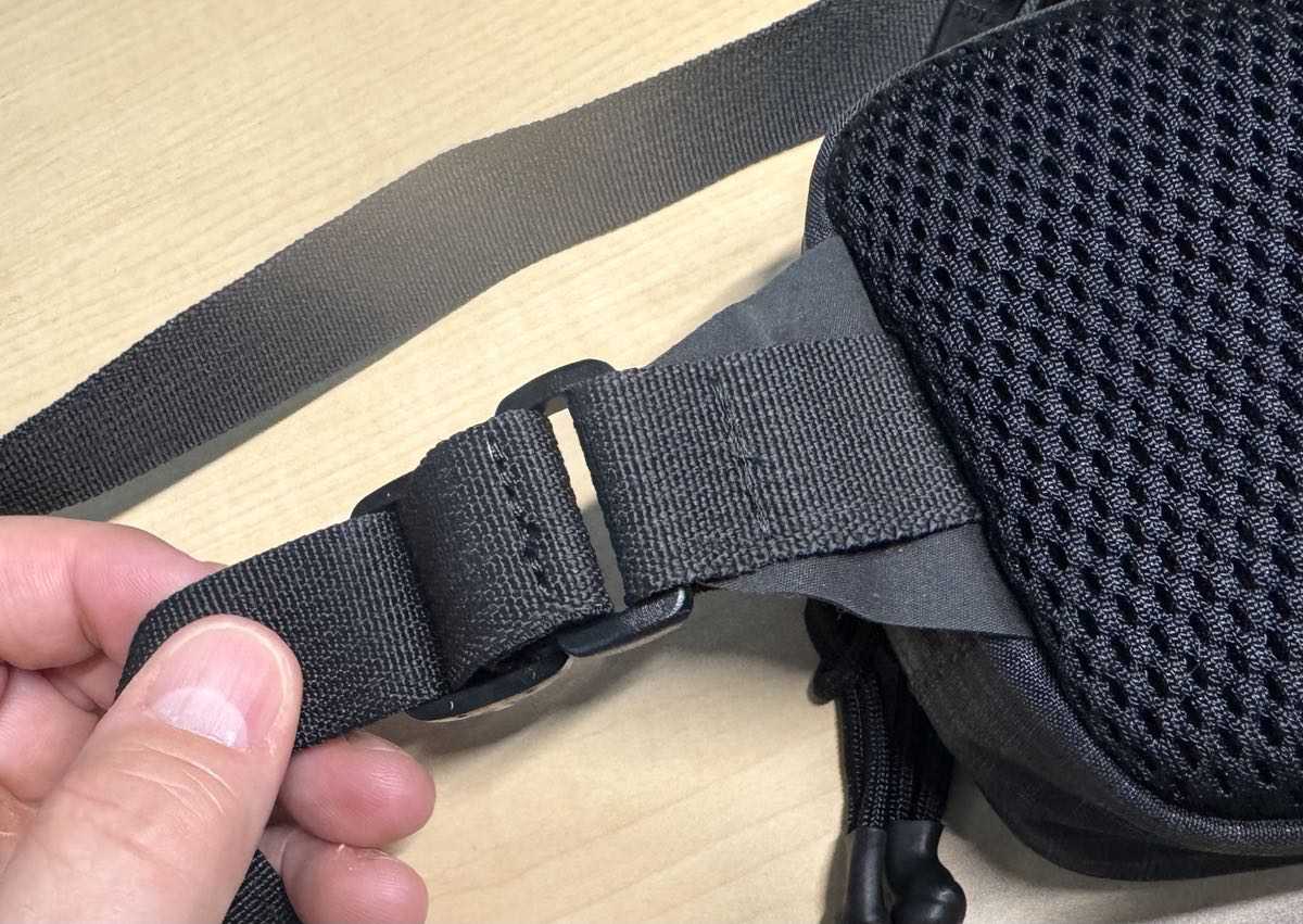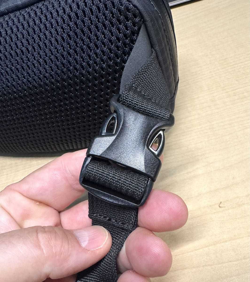 The extra length in the strap allows for crossbody carry, even with my chonky frame. It slides easily between chest- and back-carry styles, although the strap could use a bit more length for hip carry if you’re a bigger/taller person.