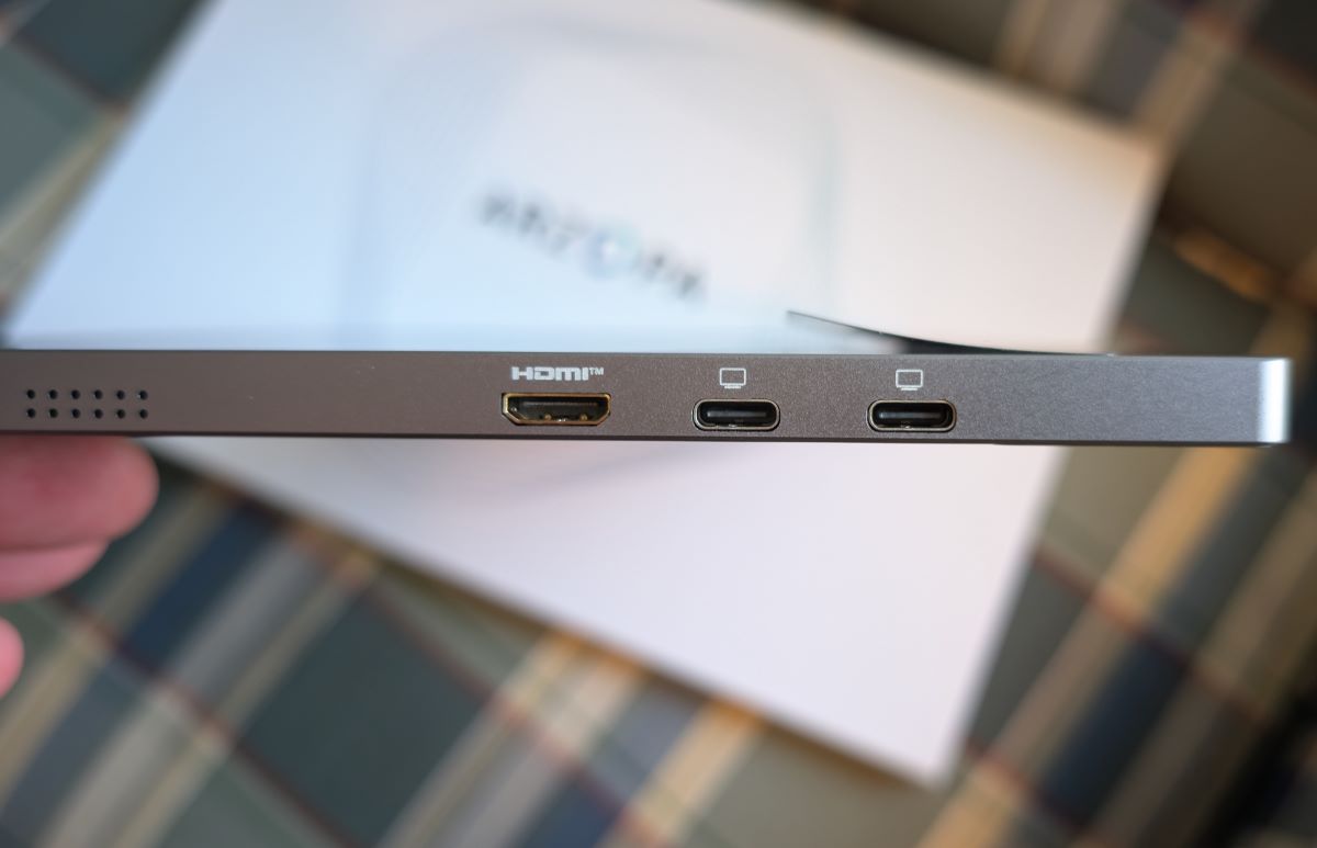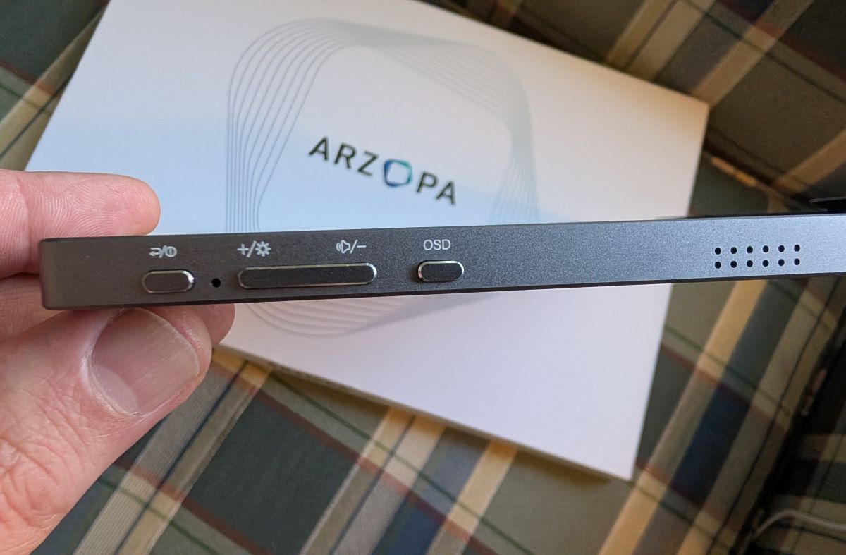 The Arzopa Z3FC has its controls and ports all on the left side. This may not sound like much, but have you ever tried to use a portable monitor with the ports on one side and the controls on the other? Trust me, it ain’t good. The control buttons are sufficiently tactile to know when you’re pressing them, too. No squishy buttons here. Again, maybe not important to you, but I’m weird and appreciate them. The controls themselves open the On-screen menus, allowing you to choose brightness levels, different modes, and adjust volume. Yep, the Z3FC has stereo speakers as well.