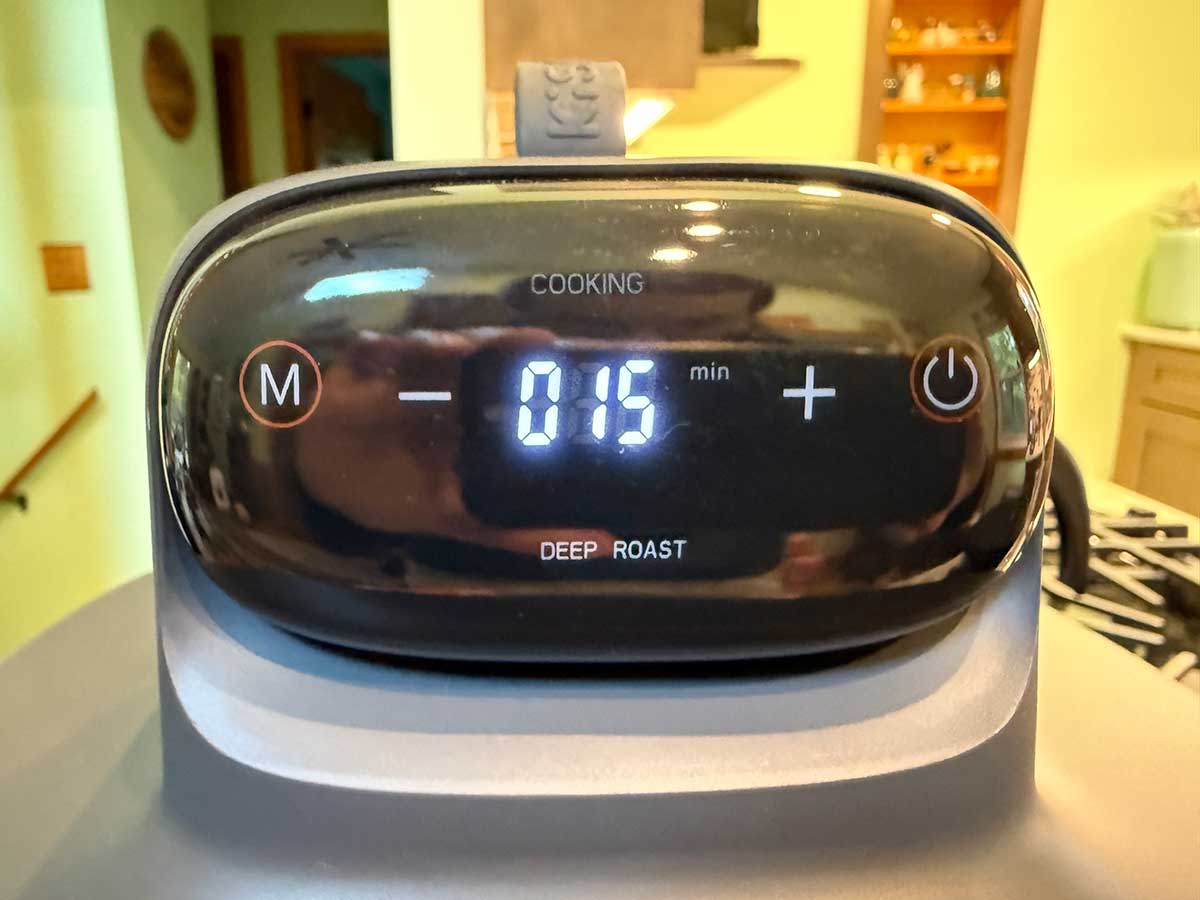 I then placed the heating pod on top and plugged it in. The user interface is about as simple as it can get. There’s a power button on the right, a mode button on the left, a timer in the center with +/- buttons on the sides so you can adjust the time. The mode button allows you to cycle between the following modes: