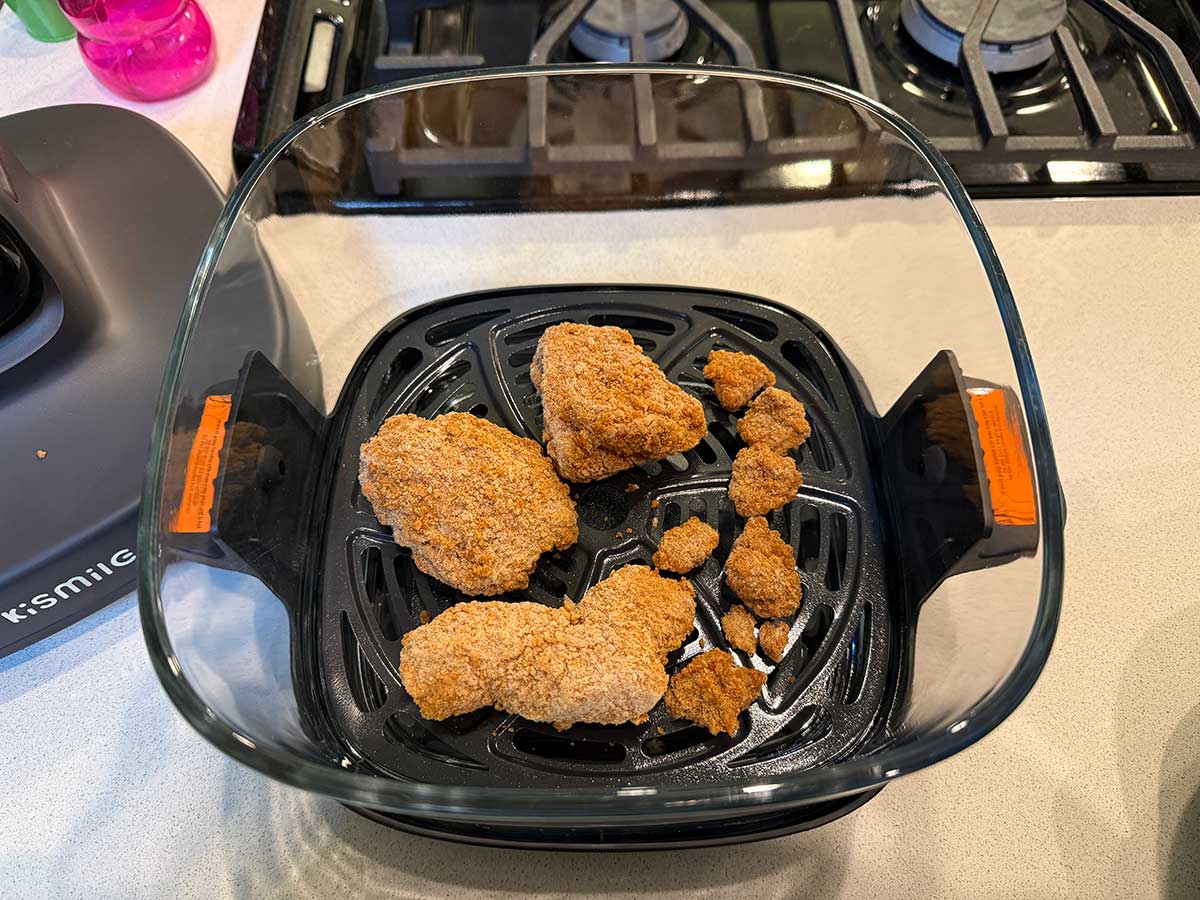 My first test was frying up some Real Good brand chicken nuggets. I poured the remainder of a bag of frozen nuggets into the larger 4.7qt container. This is just one serving, so you can see how small the glass container is.