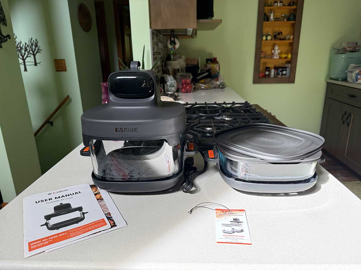 REVIEW – I don’t know about you, but I use an air fryer at least 3 times a week to heat up leftovers and fix fresh dishes. I enjoy the ease of one-dish cooking, but when I have leftovers, I have to store them in a separate container. The Kismile 5-in-1 Portable Glass Air Fryer solves that issue and potentially a couple more. But does it introduce problems too? Let’s find out