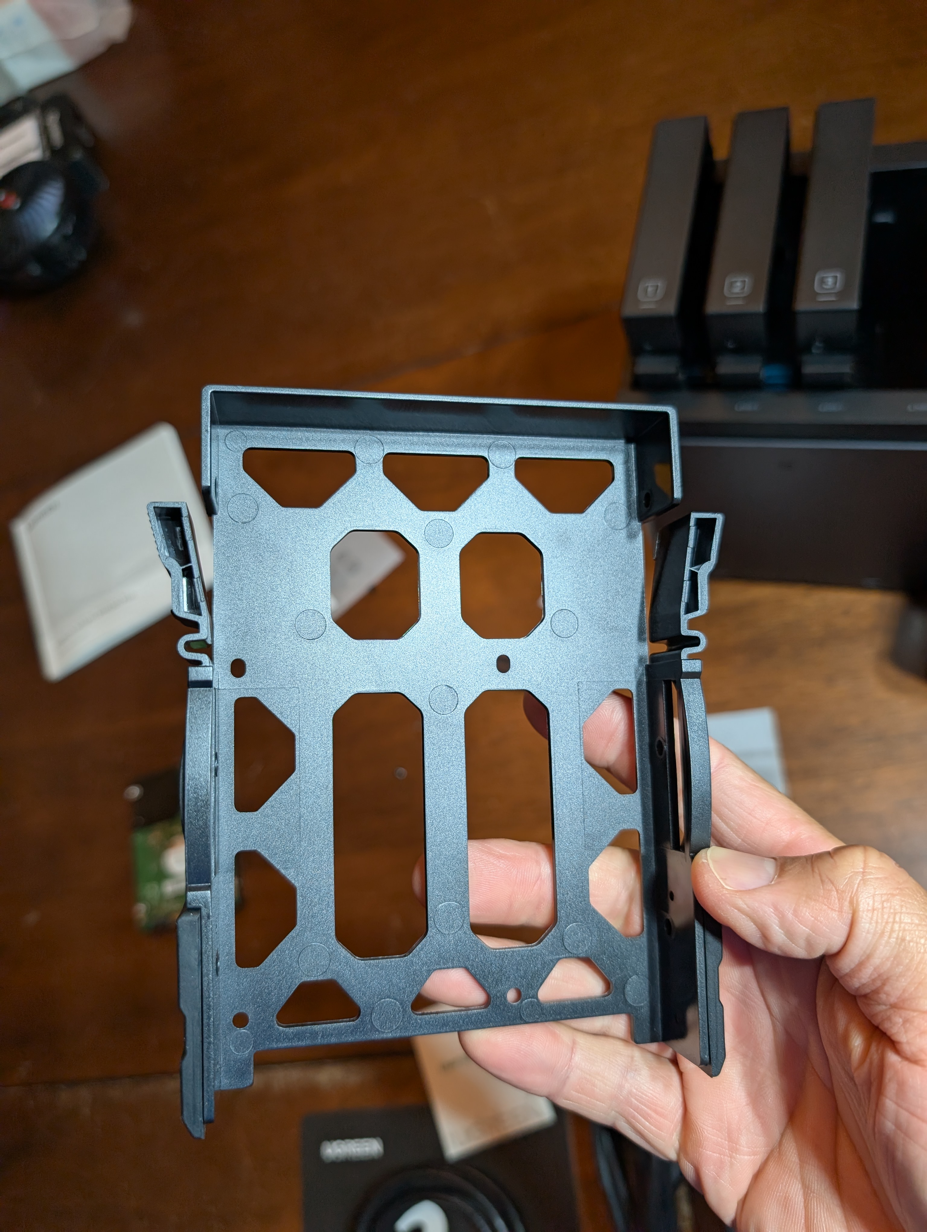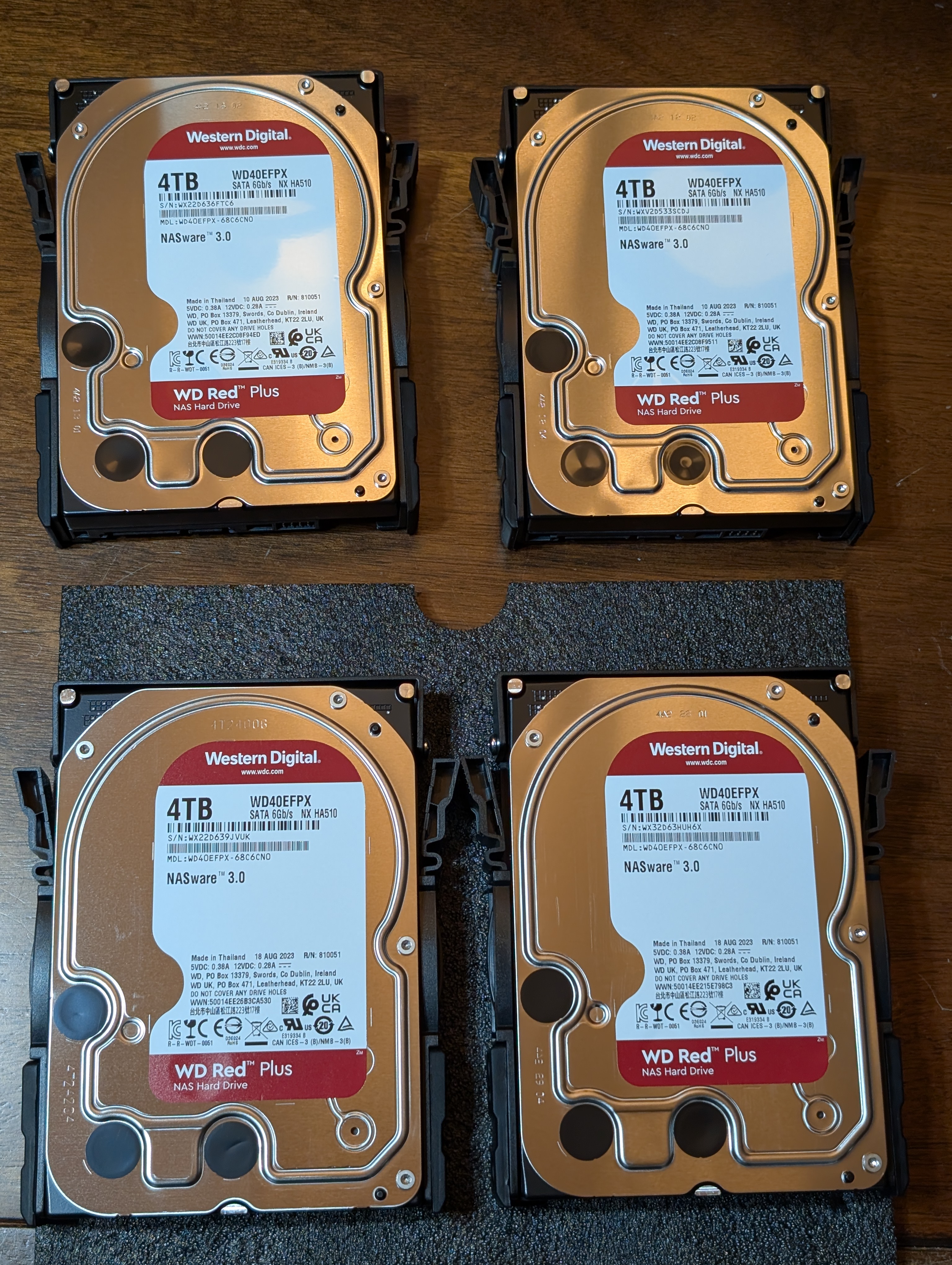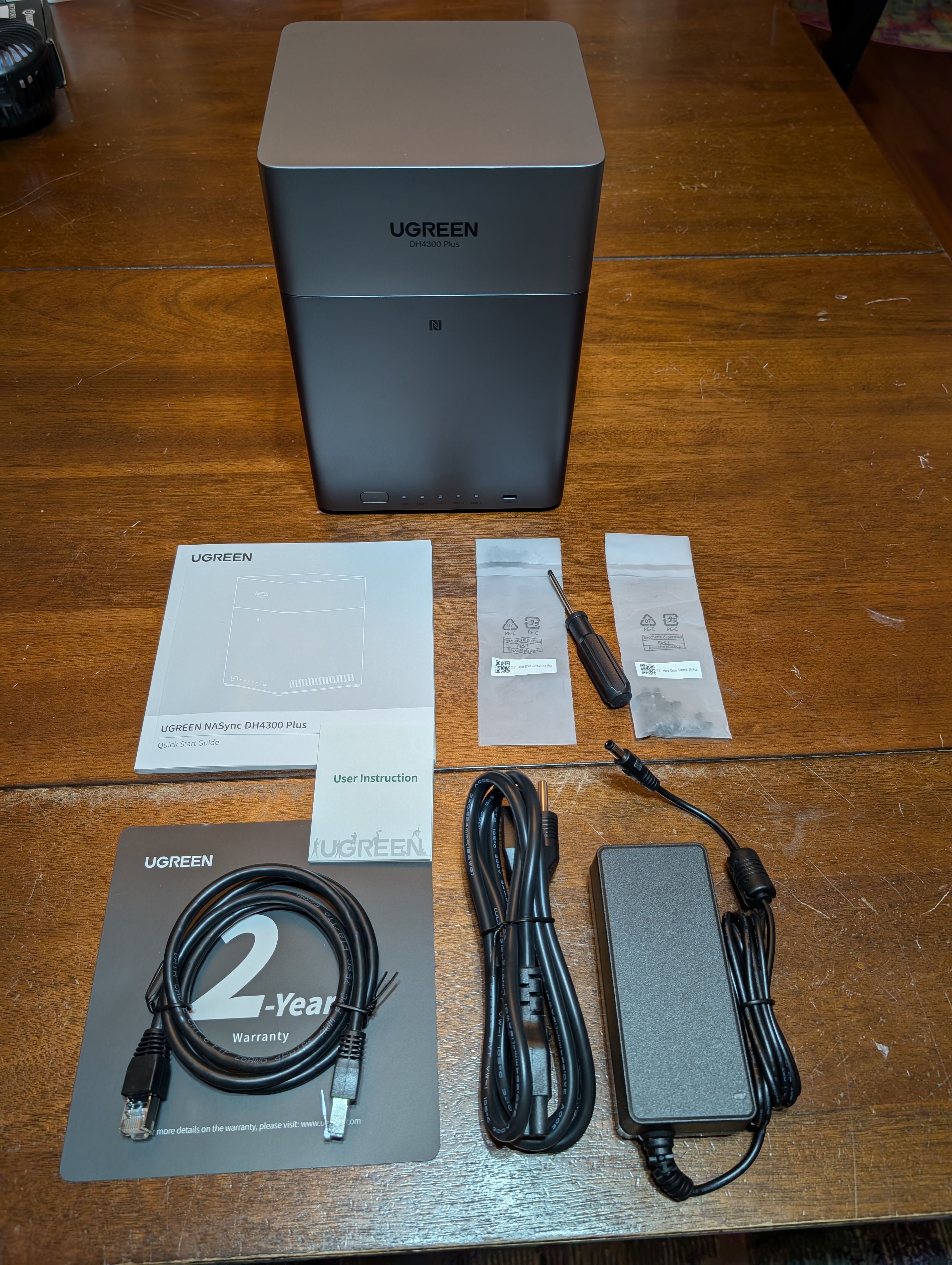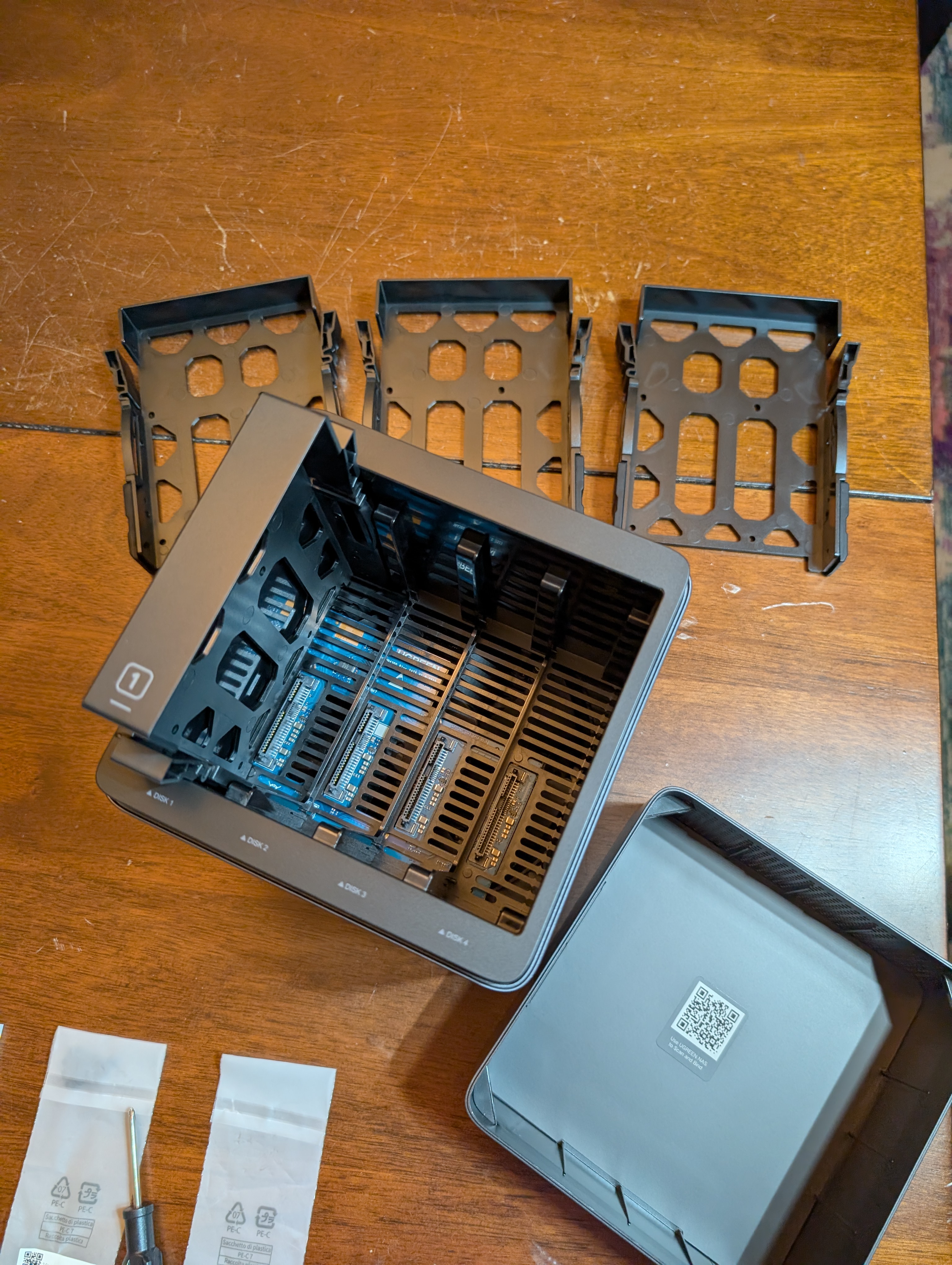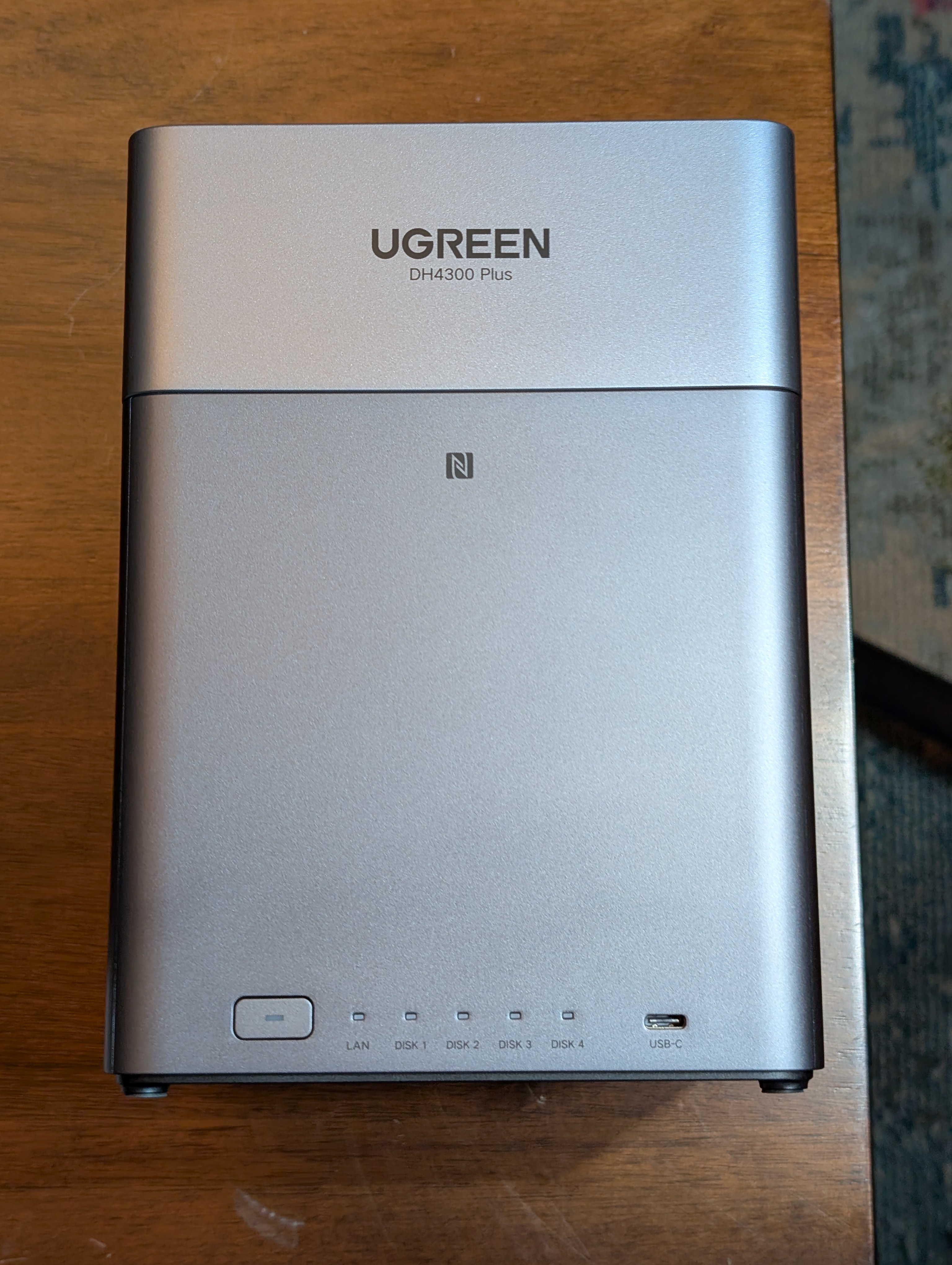 UGREEN recommends 3.5” NAS-specific SATA hard drives, such as Western Digital Red or Seagate IronWolf, although 2.5” hard drives will fit as well. The DH4300 Plus does not come with hard drives, but UGREEN was kind enough to send four 4TB WD Red Plus drives for this review. I installed all the hard drives using the provided screws. I was careful with the plastic trays as they seem a bit delicate, but I think they are designed to reduce vibration and help heat transfer, and once installed, they shouldn’t be handled that much anyway. Once everything was installed, I powered it up.