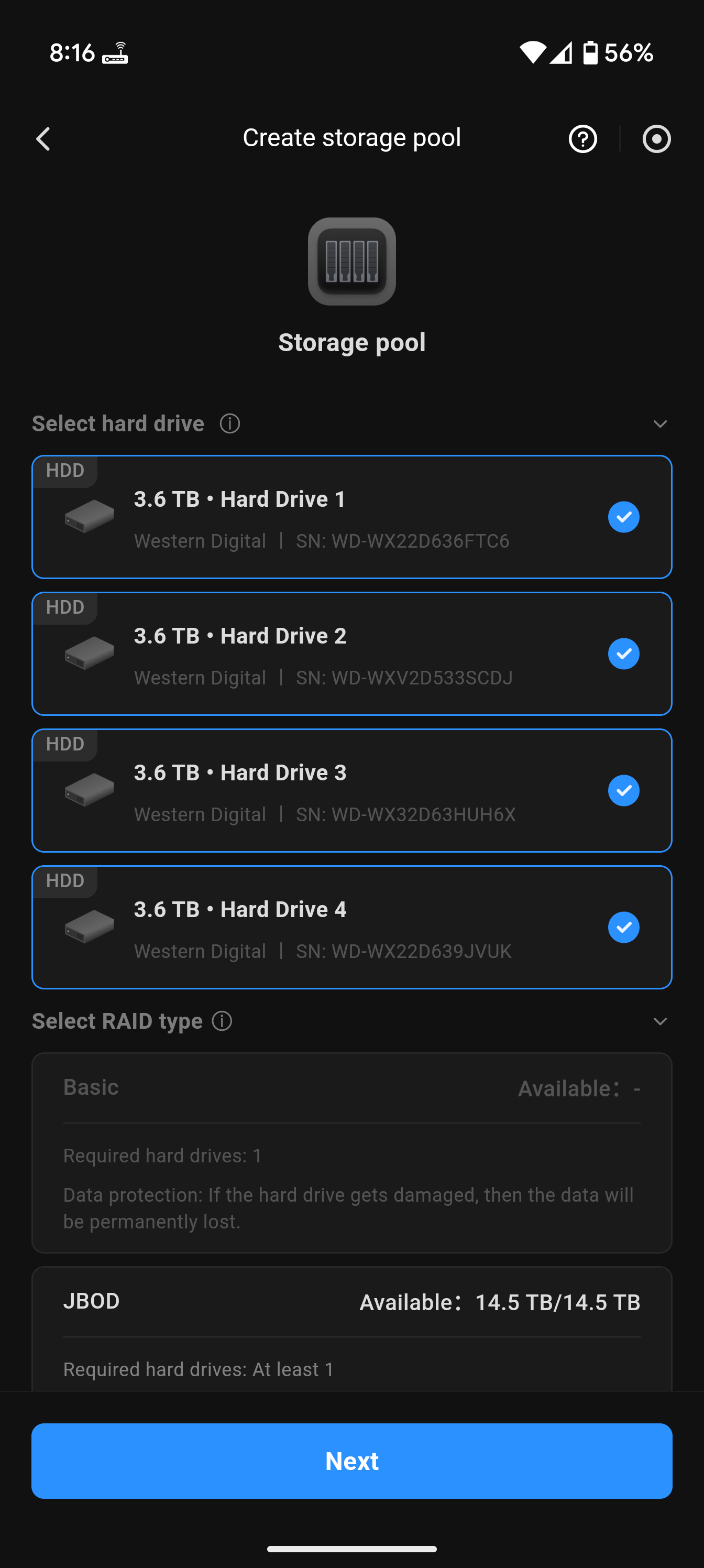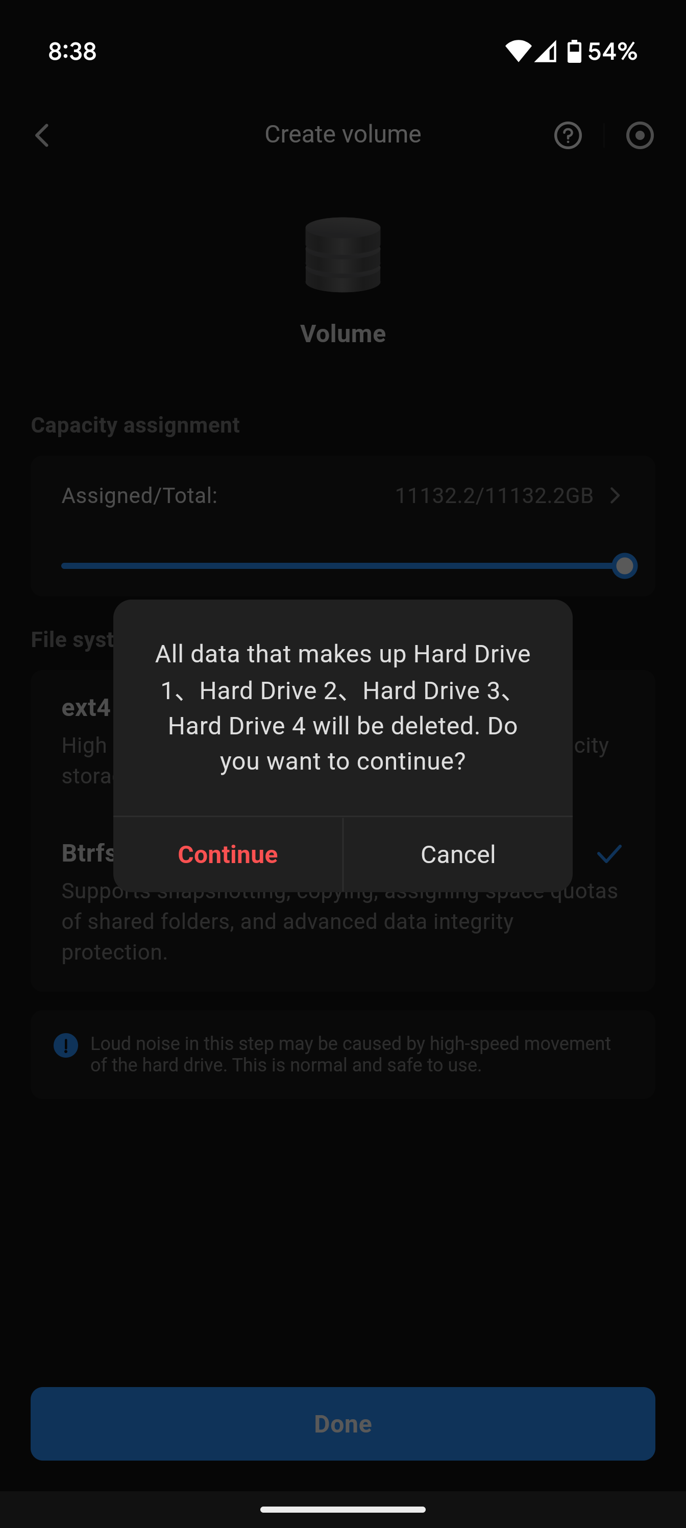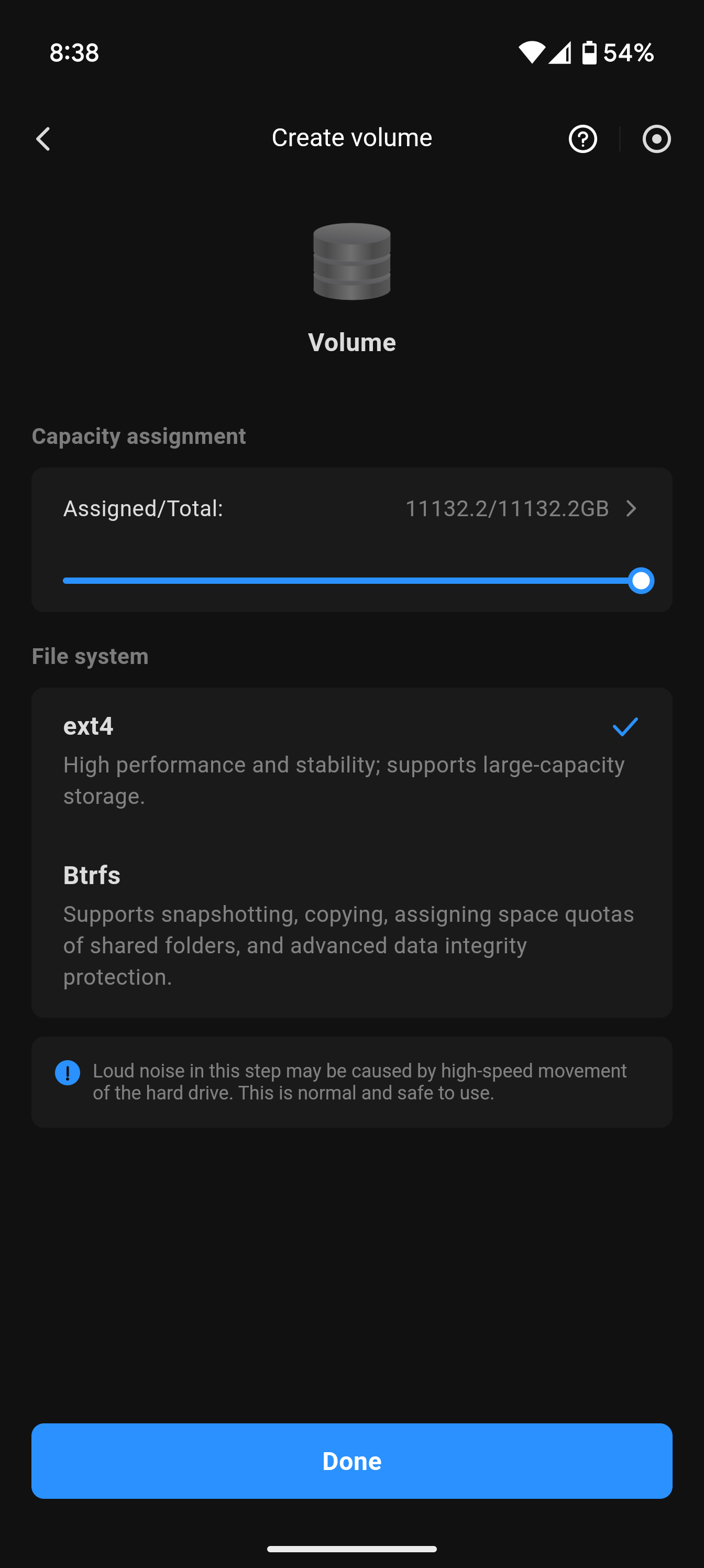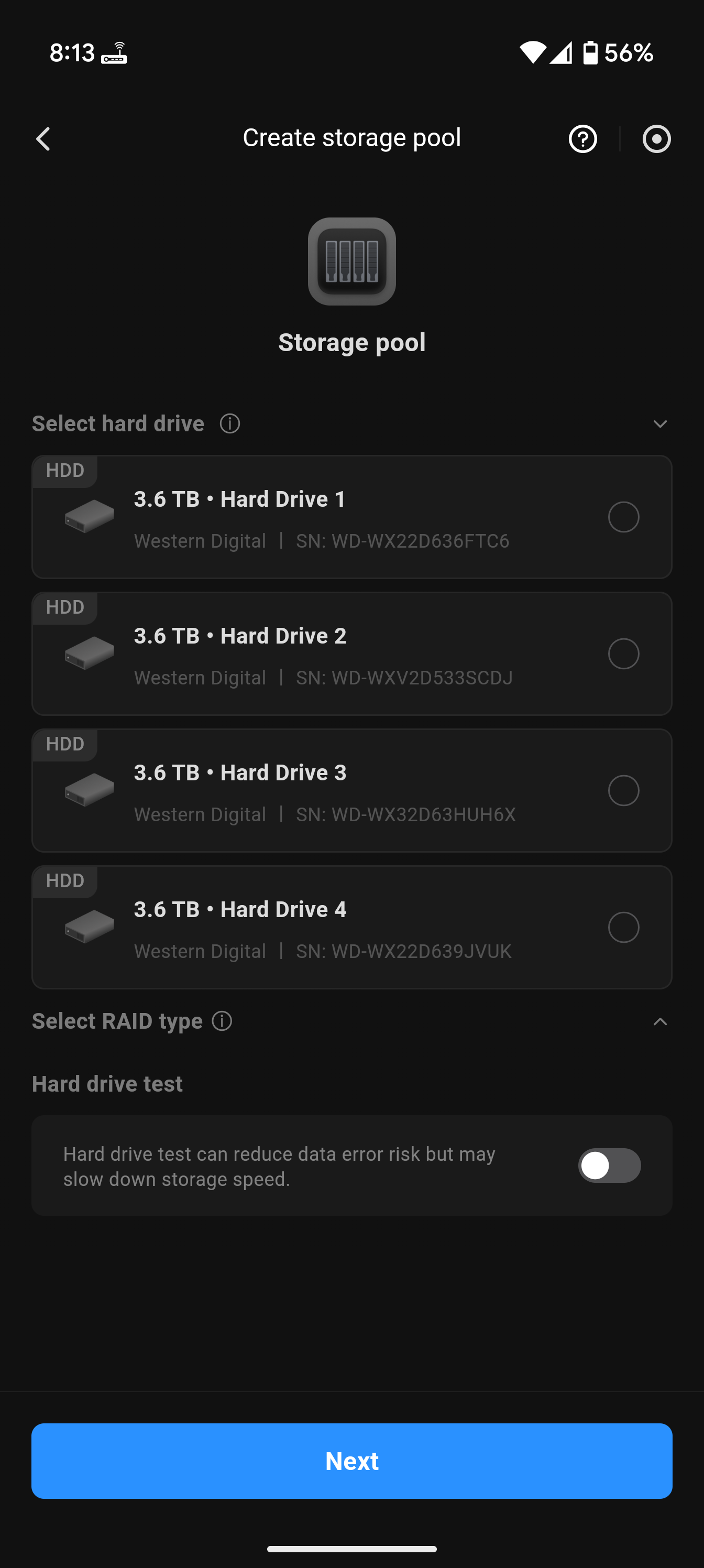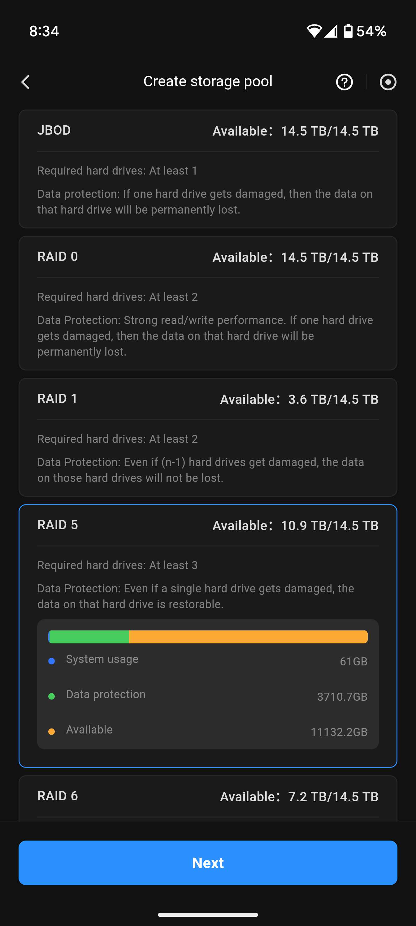 Then I got to setting up the actual storage pool. UGREEN has the following tutorial on choosing the right storage mode. I paused the setup when I got to this part and did some more research online. I ended up choosing RAID 5 for my setup and Btrfs file format. I definitely recommend doing a little research to see what will suit your particular needs best before committing. Since I was using brand new drives, I elected not to run the hard drive test. If you are using older used drives, it might be prudent to check the hard drives for errors, and that could potentially take days, depending on the size of the drives. Overall setup and prep of the new drives took about 30 mins. The process will completely erase all data on the drives, so if you are using used drives, make sure you transfer any needed files beforehand.