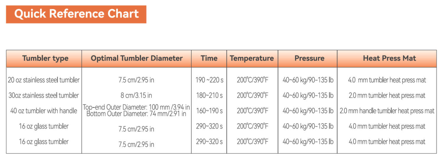 - D: 40 oz. handled tumbler (170 seconds, requires 40 oz. handled insert and wrap)