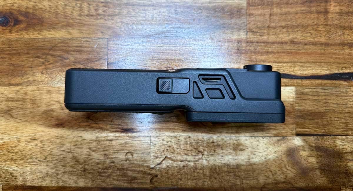 When you flip the handle over, you see the camera, lens, and the multi-function button that toggles power and recording.