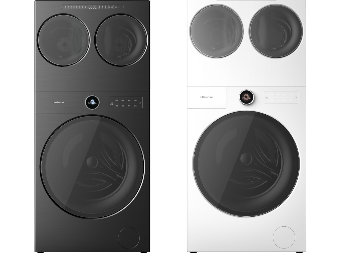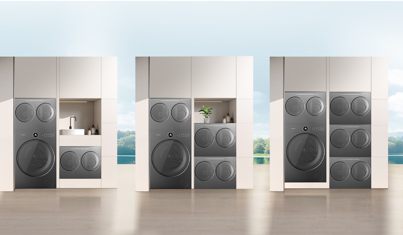 Excel Master is the product Hisense saved for last, and it’s the most interesting. This is the world’s first modular washer/dryer system that you can keep expanding. You start with a main unit that works as a regular full-size washer and dryer. It uses heat pump technology, which means lower energy bills and gentler drying. Then you can add mini modules whenever you need more capacity. Each mini module has two small drums that wash and dry separately. Add as many as you want.
