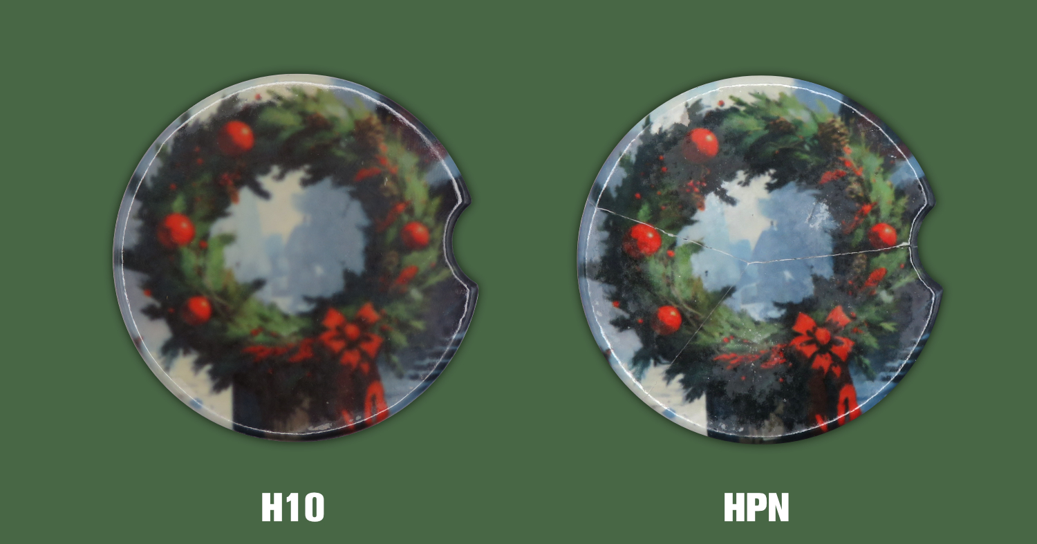 Confession: I really hate pressing ceramic. I’ve only gotten consistently good results with vacuum sublimation, which is considerably more expensive than standard sublimation with regular paper and a press. The H10 doesn’t apply enough weight on its own to properly sublimate ceramic, and the long press time (200 seconds – over three minutes!) means leaning over the press to apply leverage is infeasible due to the safety profile of the sublimation ink. I will continue avoiding pressing ceramic, unfortunately – as you can see in my photo, my heat press cracked the ceramic! Dialing in the pressure is really tedious and difficult with flat ceramic, especially when working with inexpensive imported blanks.