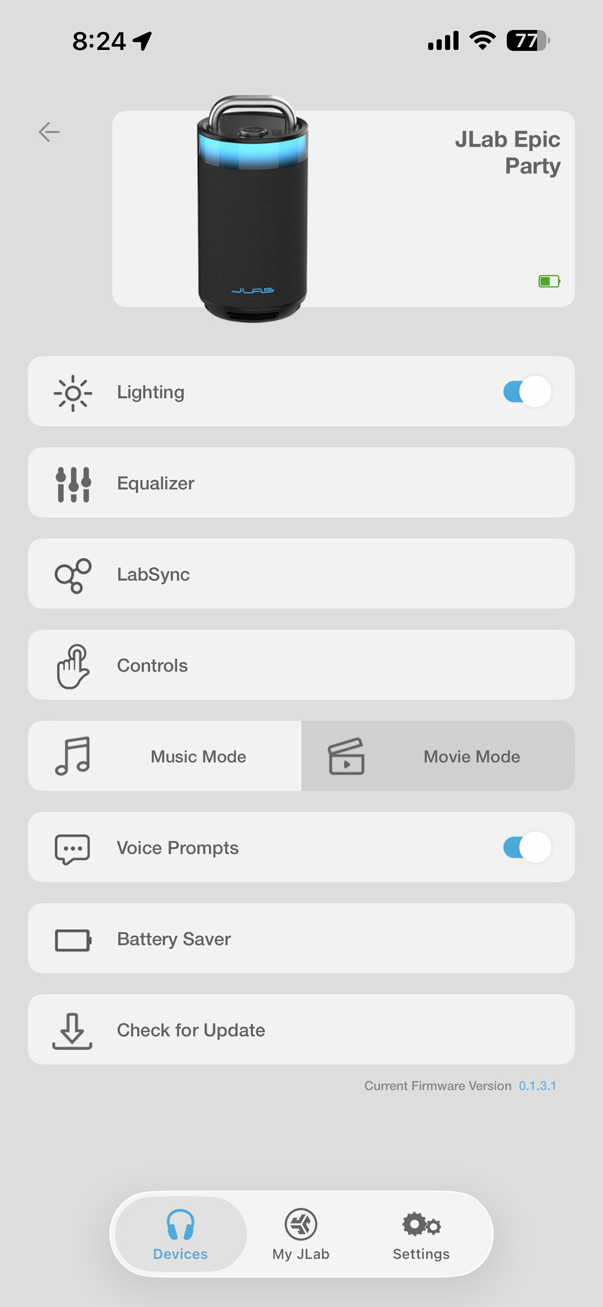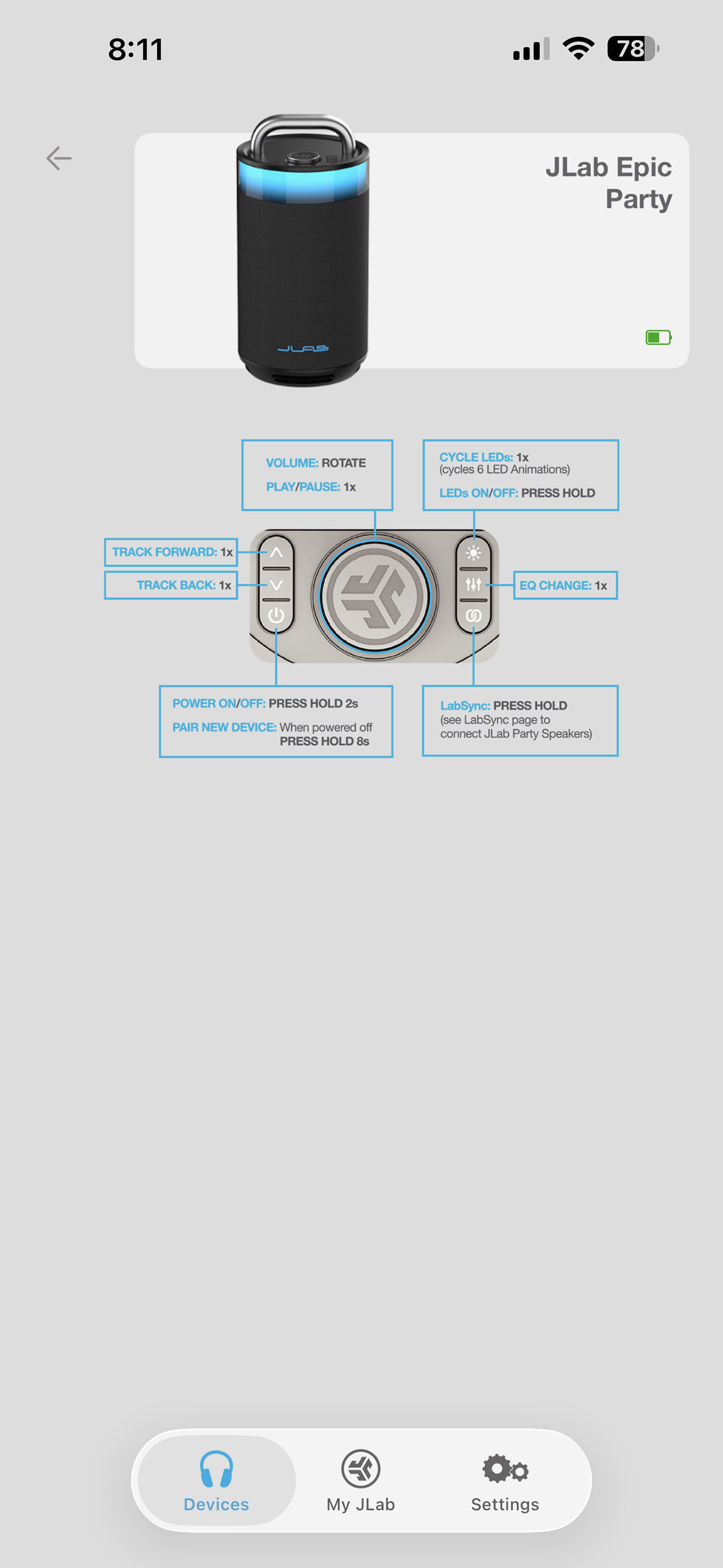 Although the function buttons are on top of the Epic Party speaker, JLab offers an app (iOS and Android) that duplicates its functions along with some extra settings. Let’s review the app settings: