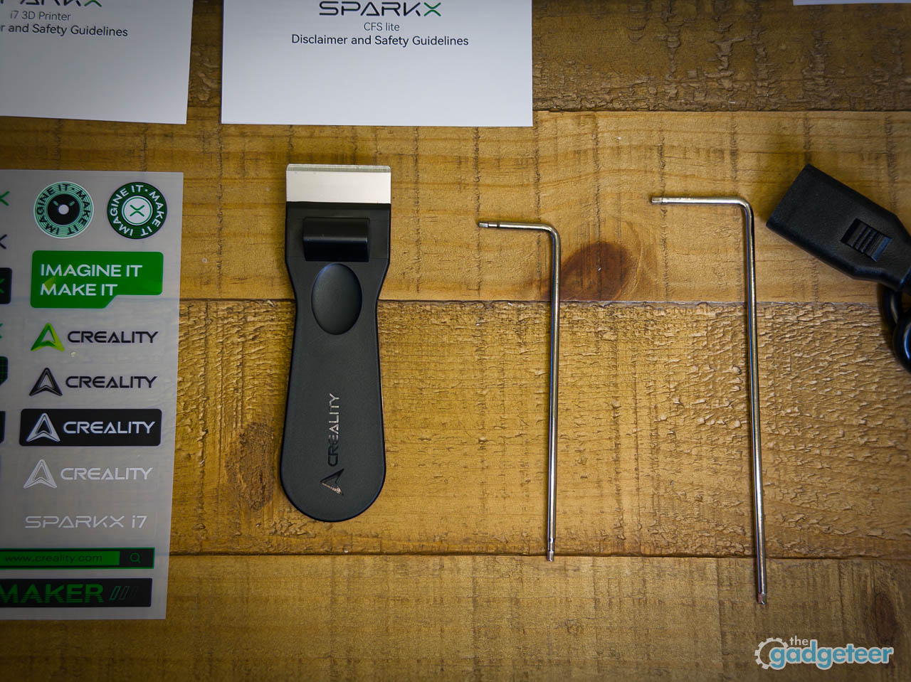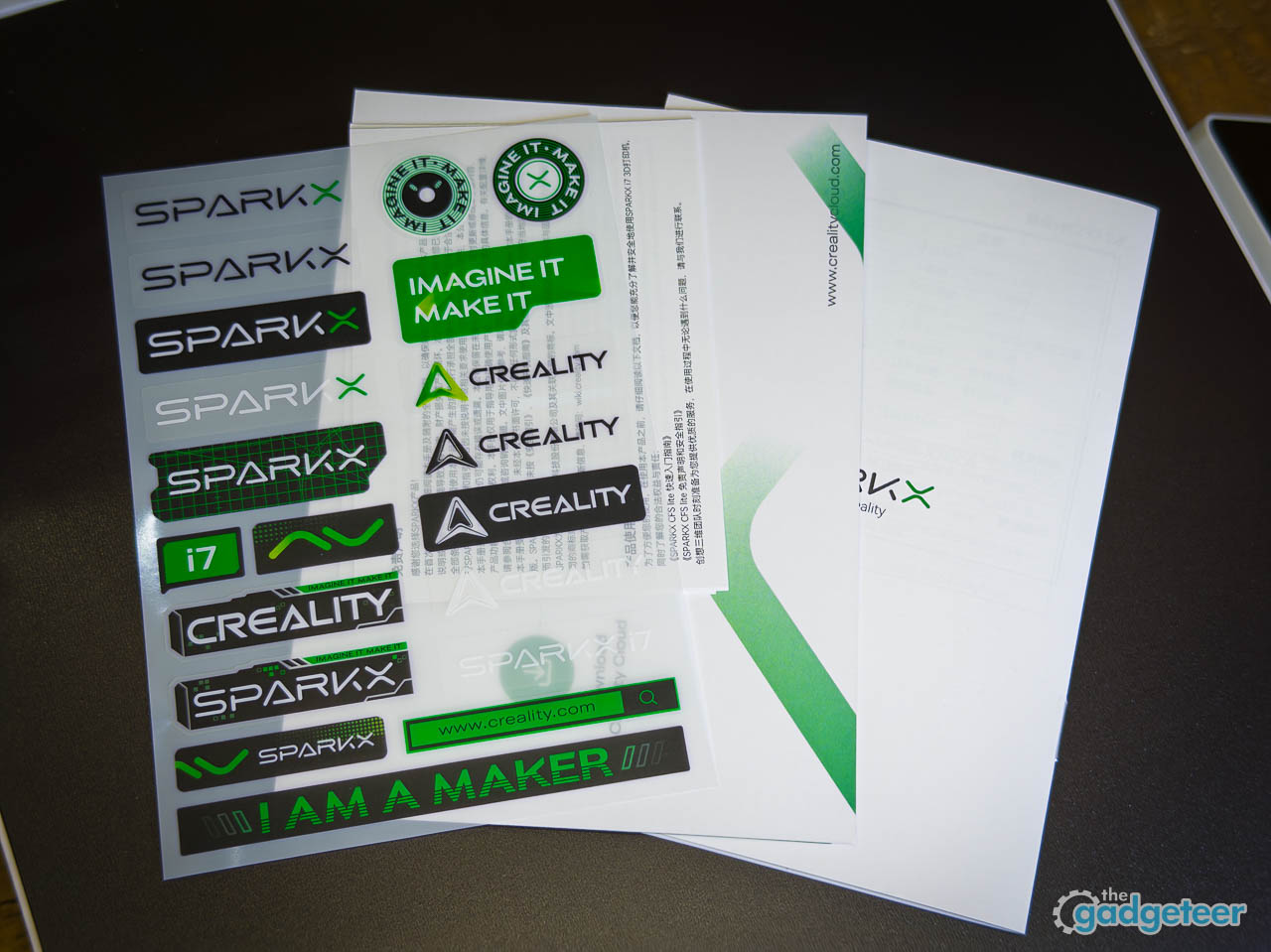 The SparkX i7 arrives with everything you need to start printing. Inside the box you will find the printer unit itself, a power cable, and an accessory box containing basic tools for initial setup and occasional maintenance. The dual-sided textured golden PEI build plate comes pre-installed, as does the quick-release hotend, which swaps without tools when you eventually need to clean or replace it. A filament cutter and a few hex keys round out the kit. Documentation includes a quick-start guide, safety notices, and QR codes linking to online setup instructions for those who prefer video walkthroughs.