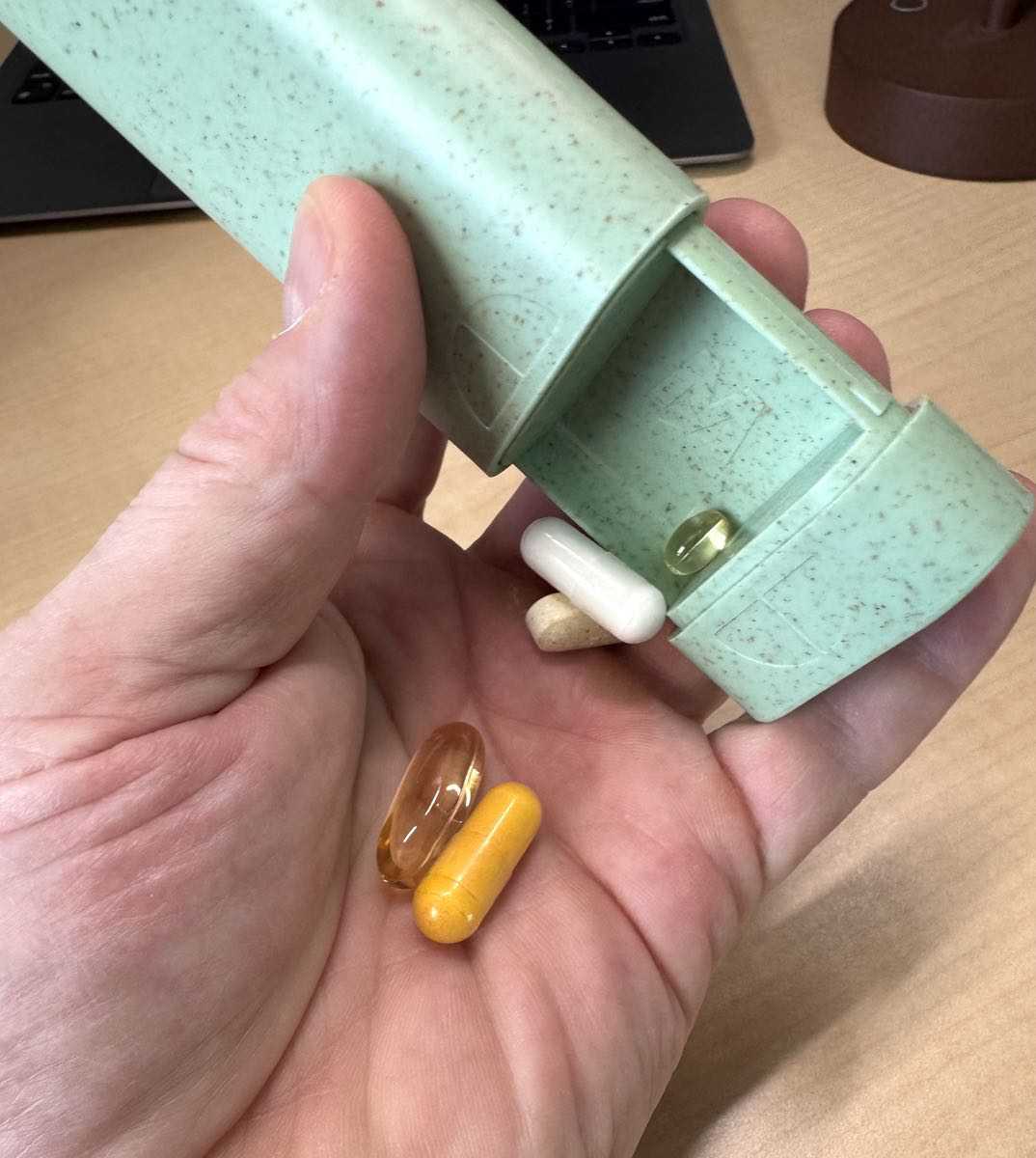 To give you a sense for capacity I’ve loaded a series of larger supplements below. On the far left you’ll find pretty standard multivitamins, followed by magnesium powder caps and larger Omega-3 gel caps. I can get about 10 vitamins, 8 caps, and 7 gel caps in these chambers without impeding performance.