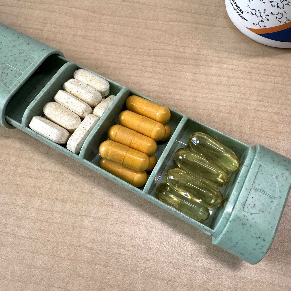 The Sequence Pillar Plus XL 7-Day Pill Organizer is a a great choice if the simple design, sturdy construction, and big compartments match up to your needs. Some may find that the 7-day capacity is limiting for longer trips, and the design doesn’t work as well if you prefer to organize your stuff by pill/capsule type rather than daily disbursement. While it’s a bigger container I would argue that it’s a better alternative to carrying a couple of smaller bottles if it matches your use case. If you like the daily slider design Sequence also makes a smaller model that may meet your needs.