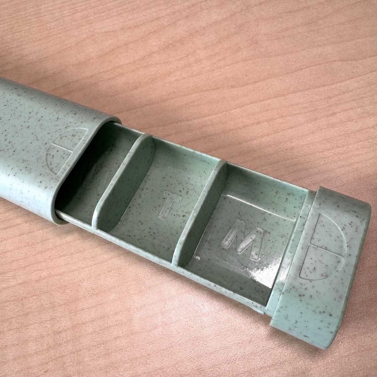It’s a 7-day pill organizer that is made from recycled/sustainable materials with wide, deep compartments for larger pills and tablets.