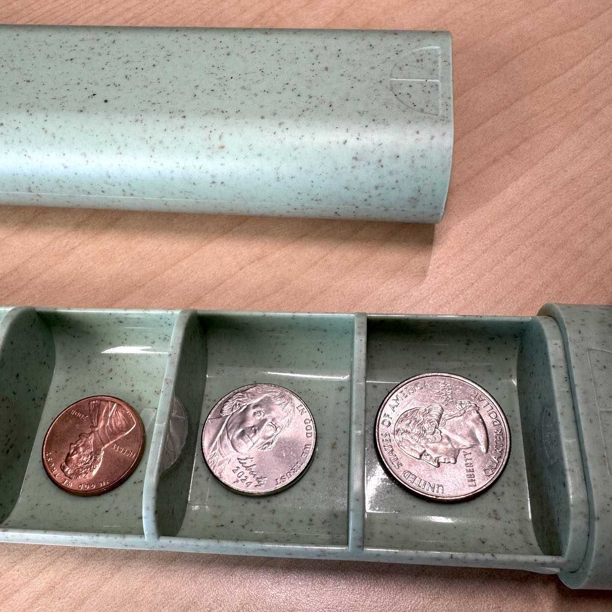The big selling point on this design is the size. I’ve dropped a few coins into the pics below to give you a size reference. Each compartment is 4 cm wide by 3 cm long by 1.7 cm deep, with a lip on the sides to keep the content from falling out during opening as long as you use that tablet icon to determine which way is up.